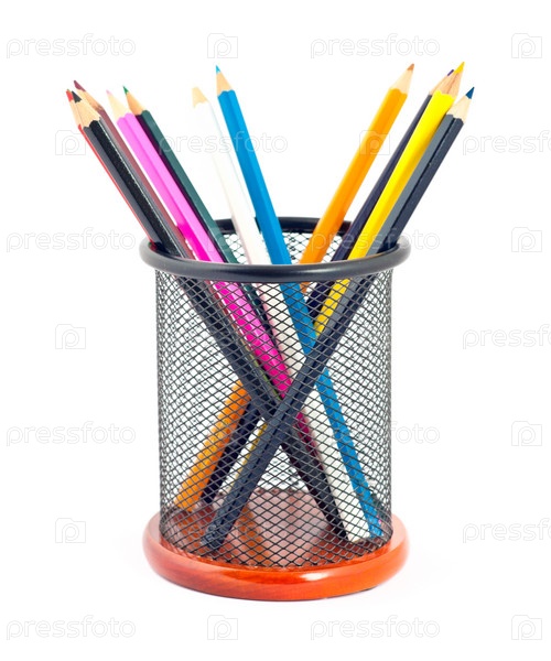 Цветные карандаши в подставке на белом фоне