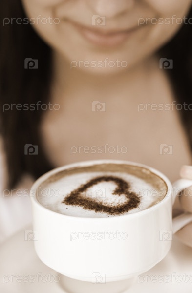Улыбающаяся женщина держит кофе, украшенный сердцем