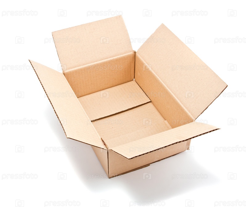 Открытая картонная коробка на белом фоне
