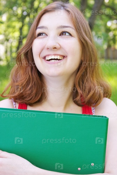 Счастливая девушка в парке с папкой