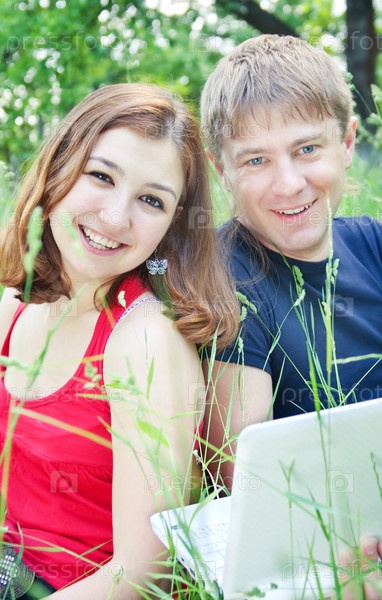 Девушка и парень с ноутбуком в парке