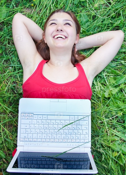 Счастливая девушка с ноутбуком в парке
