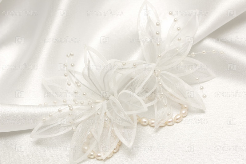 Свадебные аксессуары и жемчуг на белом шелке