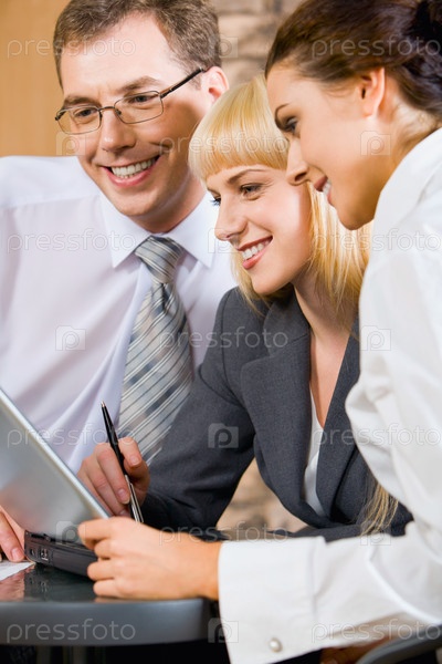 Портрет трех уверенных офисных чиновников, обсуждающих новый план