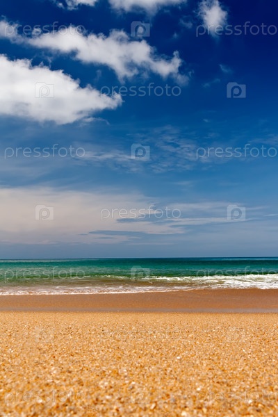 Песчаный пляж с бирюзовой водой и облака в голубом небе
