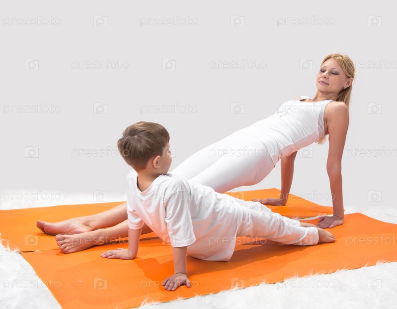 Красивая молодая мать практикует йогу с сыном