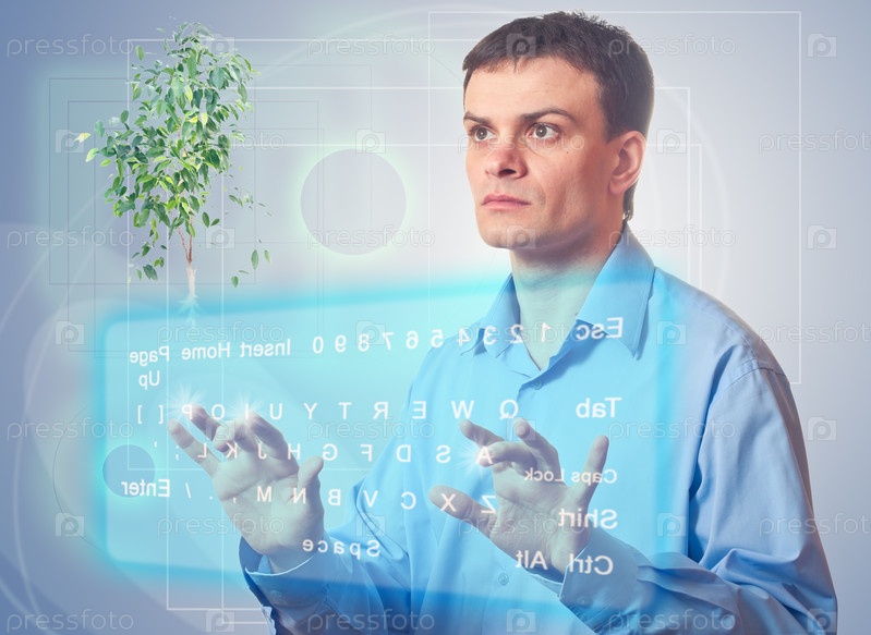 Молодой человек с виртуальной клавиатурой изучает вопросы экологии