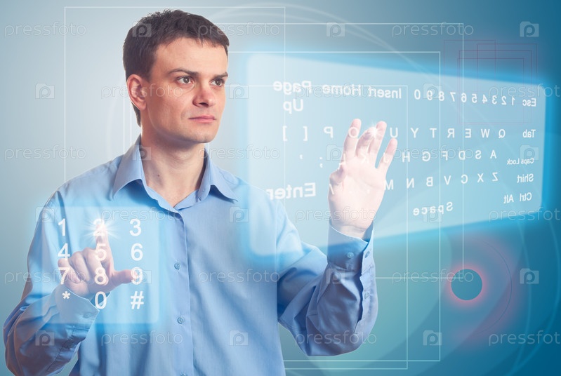 Молодой человек с виртуальной клавиатурой на голубом фоне