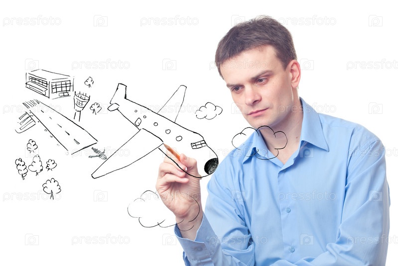 Бизнесмен рисует летящий самолет. Изолированный на белом фоне