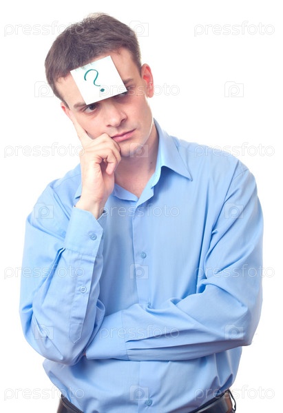 Задумчивый бизнесмен со стикером на лбу. На стикере вопросительный знак. Изолированный на белом фоне