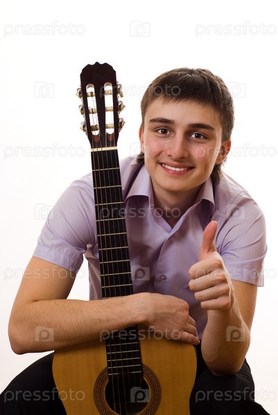 Довольный молодой человек с акустической гитарой на белом фоне
