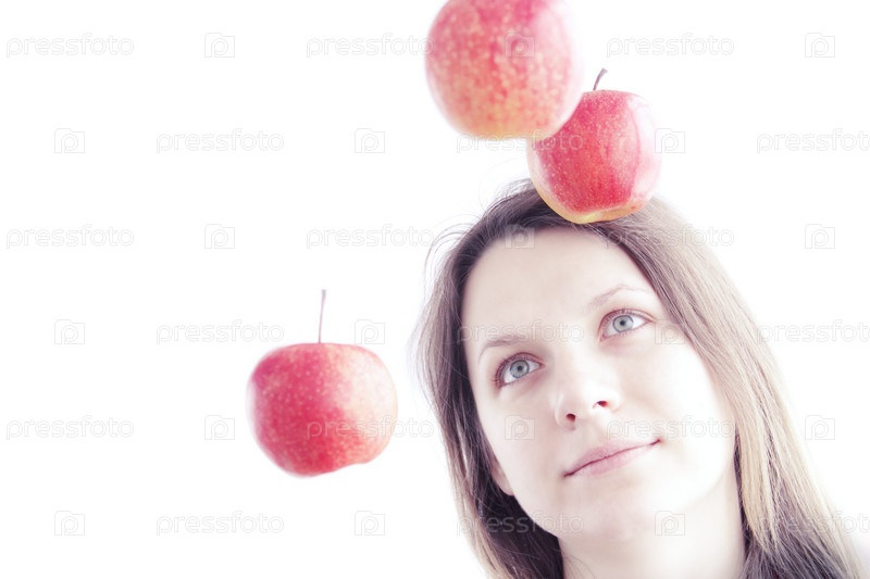 Девушка жонглирует яблоками на белом фоне