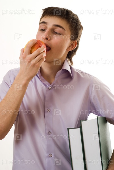 Симпатичный студент держит книги и ест яблоко на белом фоне