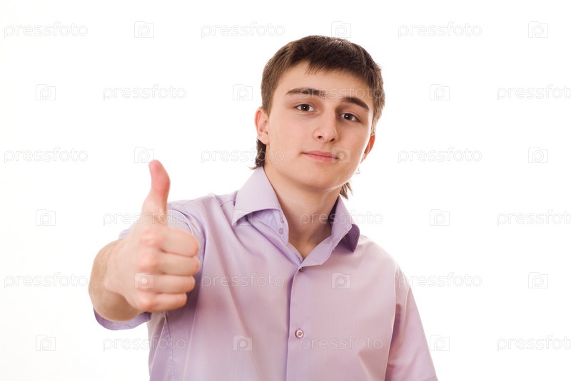 Симпатичный молодой человек показывает большой палец на белом фоне