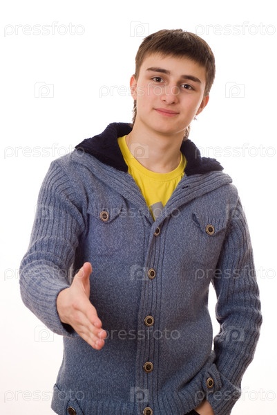 Симпатичный молодой человек в шерстяной кофте протягивает руку для рукопожатия на белом фоне