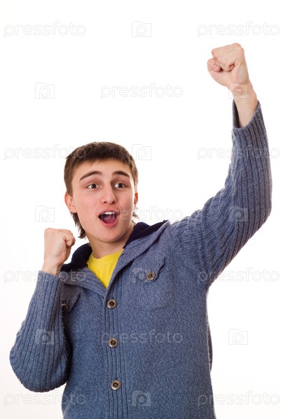 Счастливый молодой человек сжимает кулаки от радости на белом фоне