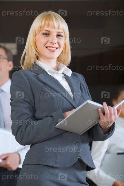 Портрет уверенной деловой женщины в костюме, держащей блокнот на фоне людей