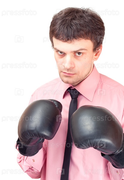 Бизнесмен с боксерских перчатках на белом фоне