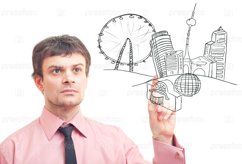 Бизнесмен рисует город на белом фоне