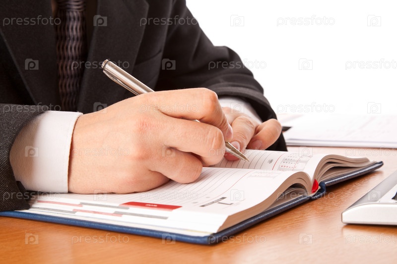 Ближайшее изображение на руках бизнесмена, пишущего в организаторе.Изолированное на белом фоне