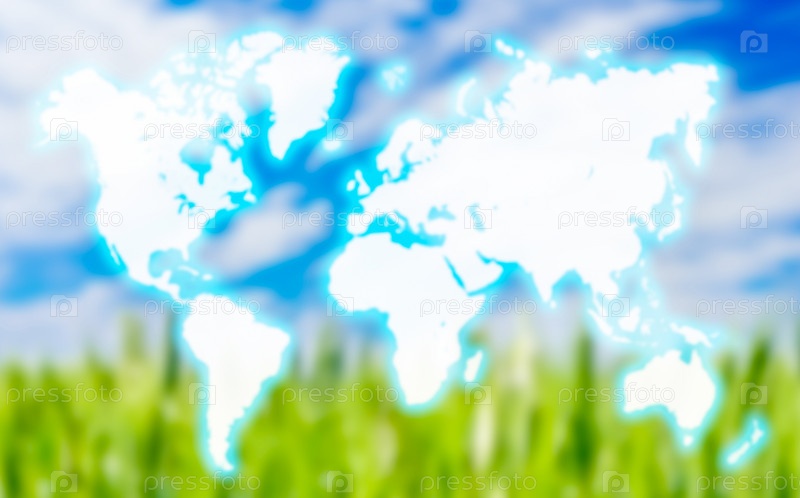 Карта мира на фоне голубого неба и травы