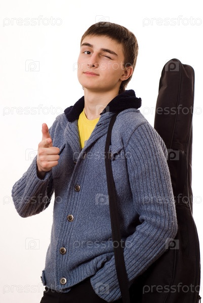 Симпатичный молодой человек с гитарой в чехле показывает пальцем в камеру и подмигивает на белом фоне