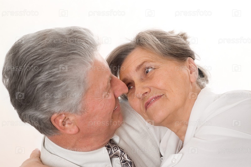 Пожилая пара обнимается на белом фоне