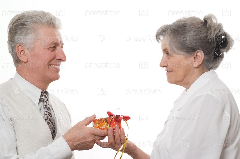 Пожилой мужчина дарит женщине подарок на белом фоне