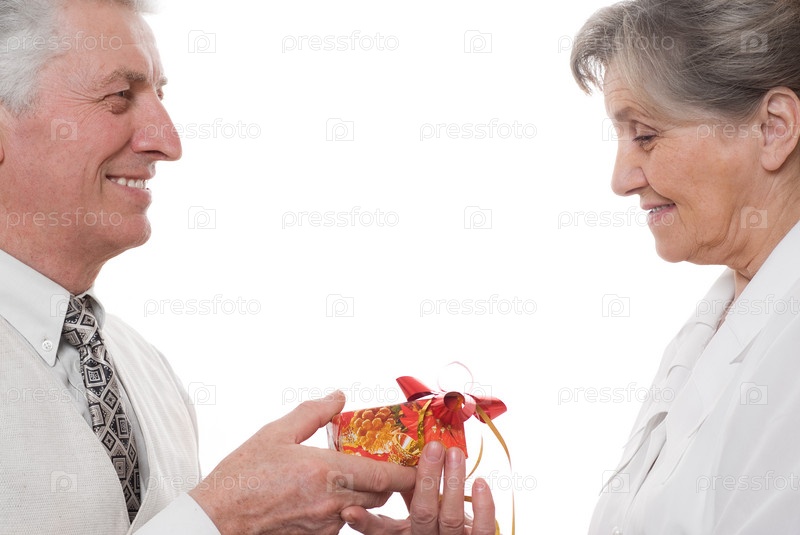 Пожилой мужчина дарит женщине подарок на белом фоне