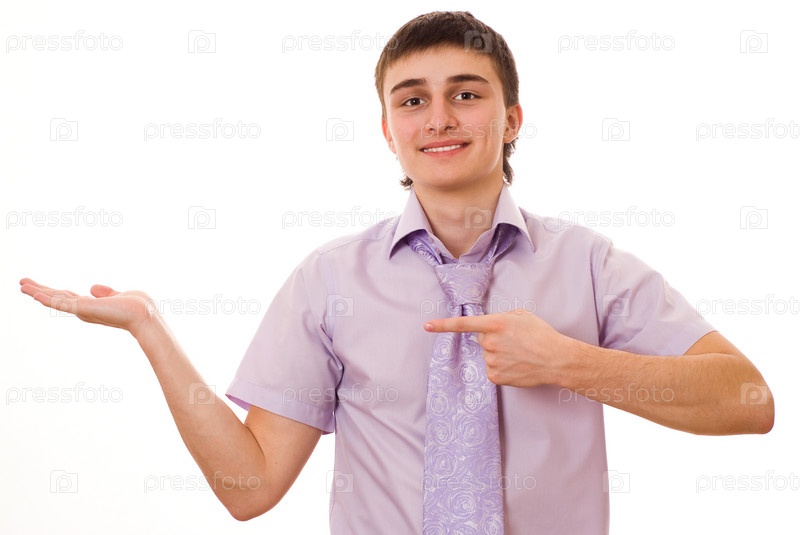 Симпатичный молодой парень показывает знаками на право