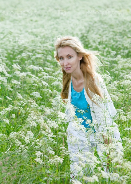 Счастливая молодая женщина в поле среди белых цветов
