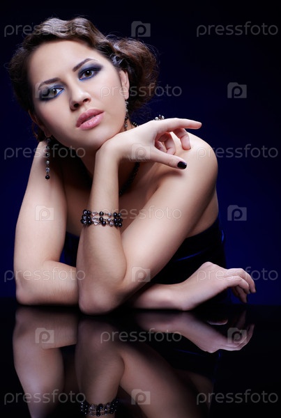 Портрет молодой брюнетки, сидящей за зеркальным столом, на синем фоне