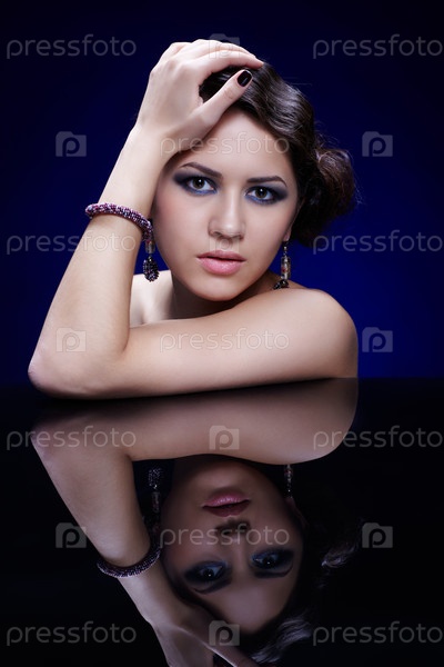 Портрет молодой брюнетки на синем фоне