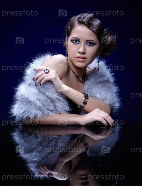 Портрет молодой брюнетки в меховом манто на синем фоне