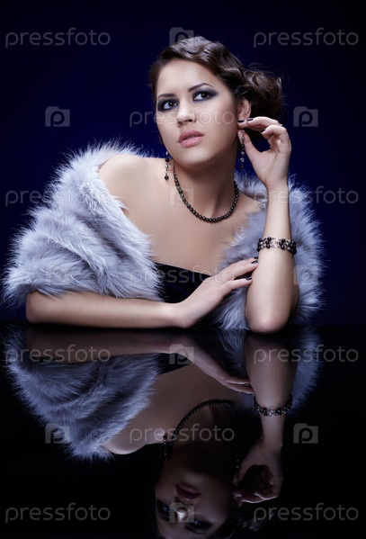 Портрет молодой брюнетки в меховом манто на синем фоне