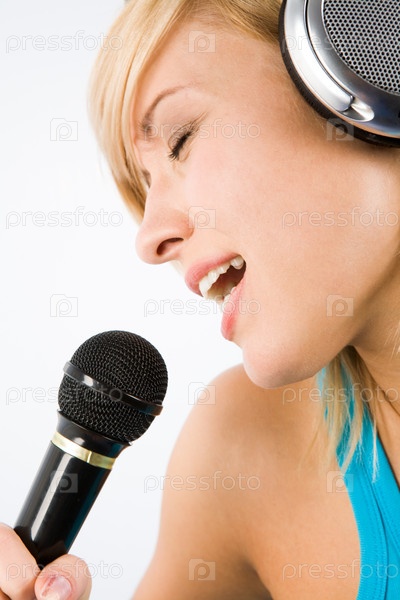 Изображение современной девочки-подростка с наушниками на голове, которая поет свою любимую песню в микрофон