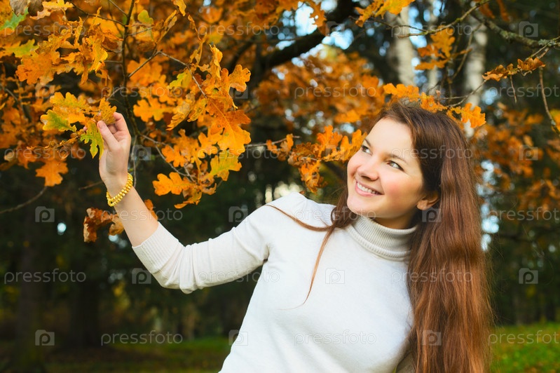 Девушка в лесу с желтыми дубовыми листочками