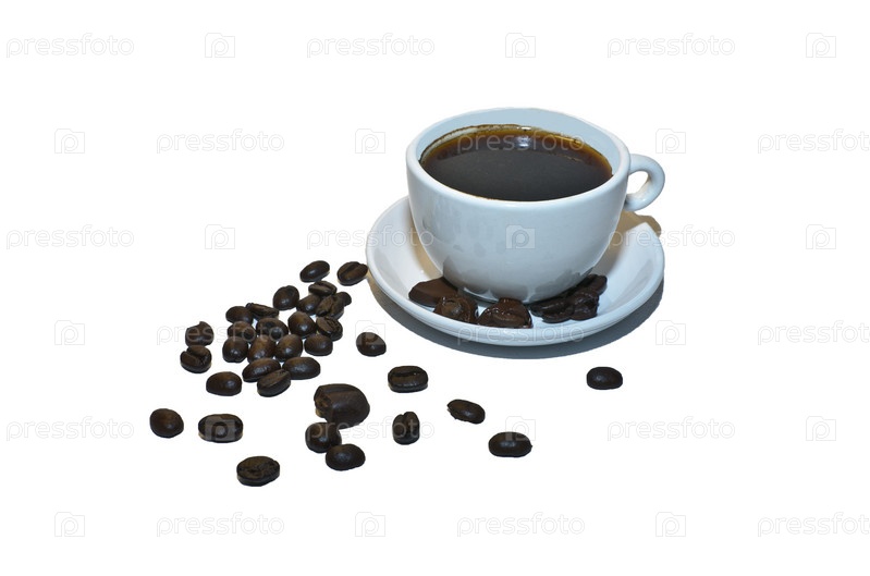 Обжаренные кофейные зерна и чашка кофе на белом фоне