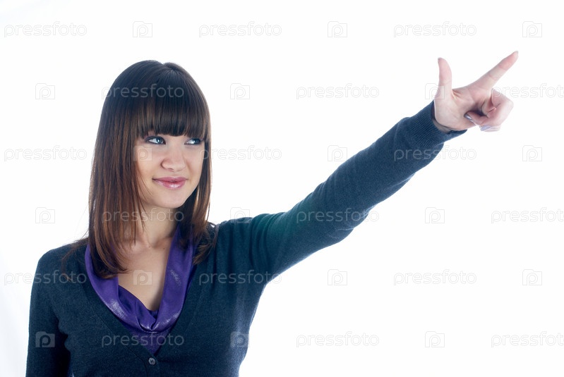 Молодая женщина указывает пальцем