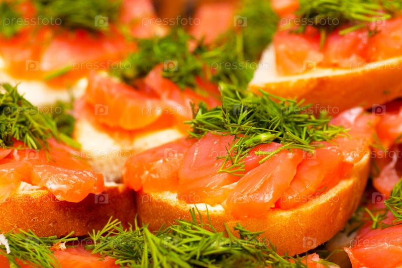 Бутерброды с красной рыбой и зеленью крупным планом