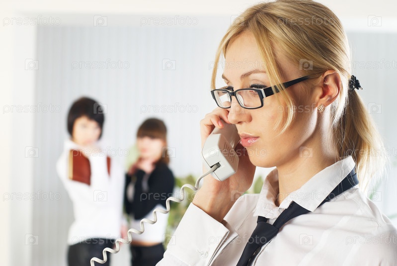 Молодая деловая женщина в офисе разговаривает по телефону