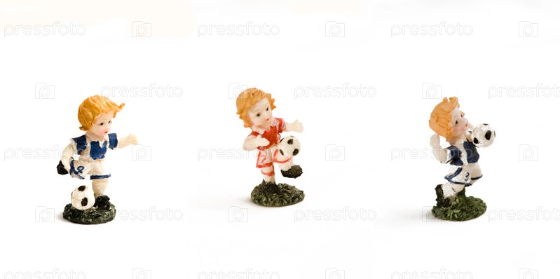 Три различных миниатюрных статуэтки футболистов, изолированные на белом фоне