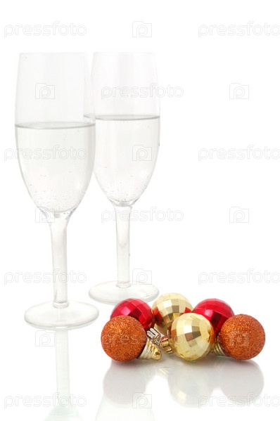 Пара шампанских флейт и рождественские шары на белом фоне