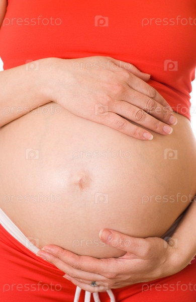 Оголенный живот беременной женщины в красной одежде