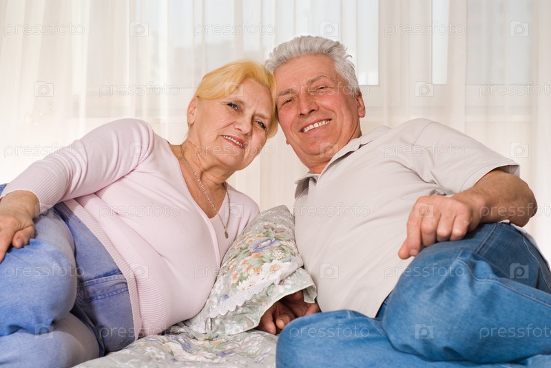 Счастливая пожилая пара лежит на кровати