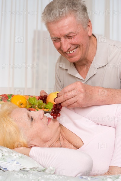 Счастливая пожилая пара. Заботливый муж приносит жене фрукты в постель