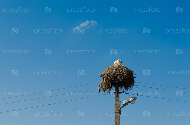 Два молодых аиста сидят в гнезде, на опоре линий электропередач