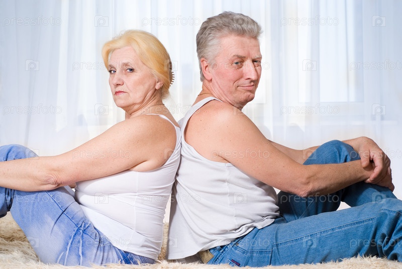 Пожилые муж и жена сидят спиной друг к другу на фоне окна