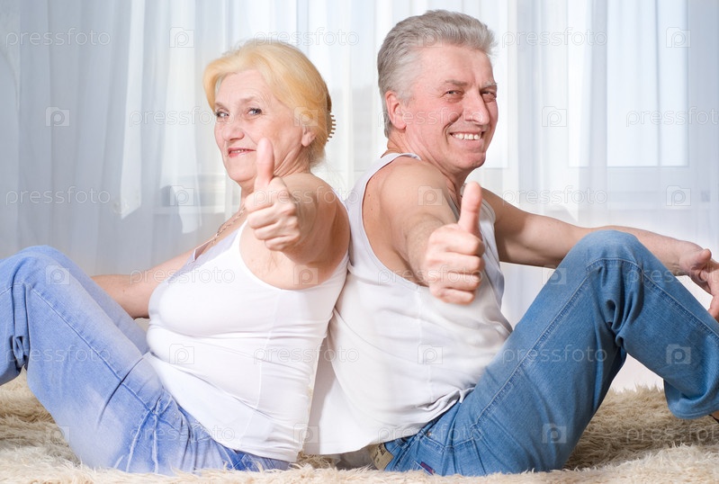 Пожилые муж и жена сидят спиной друг к другу и показывают большие пальцы