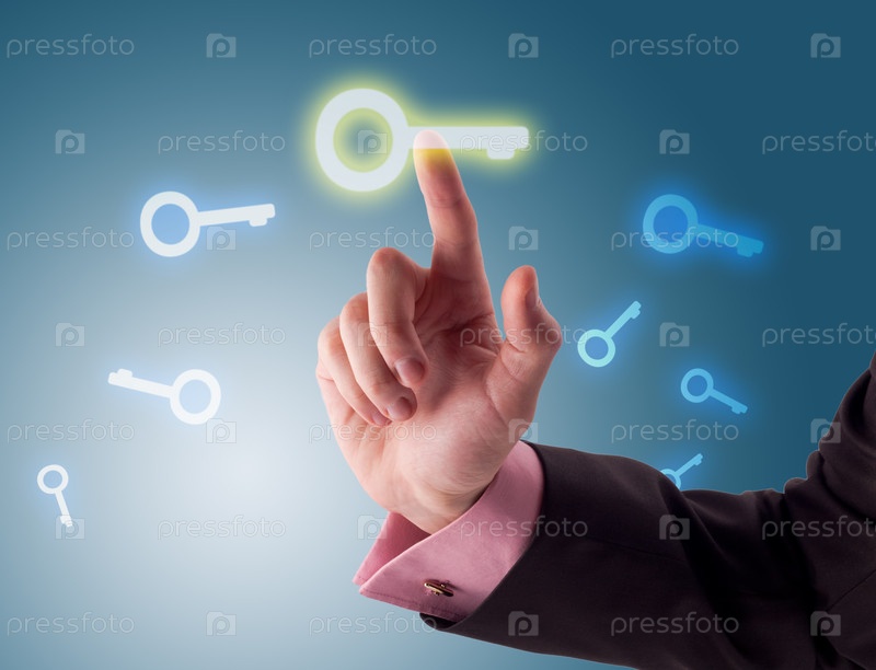 Рука бизнесмена нажимает кнопку "ключ" на сенсорном экране